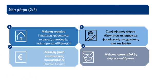 Επίσης, η κυβέρνηση αποφάσισε στοχευμένη επέκταση του μέτρου μείωσης των ενοικίων κατά 40% για το διάστημα Ιουλίου- Αυγούστου προχωρώντας παράλληλα σε επιστροφές φόρου συνολικού ύψους 70 εκατ. ευρώ στους ιδιοκτήτες ακινήτων οι οποίοι υπέστησαν απώλεια εισοδήματος.