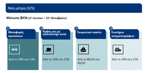 Από την πλευρά του, όπως ανακοίνωσε ο υπουργός Οικονομικών, Χρήστος Σταϊκούρας, εξειδικεύοντας τα παραπάνω, από την 1η Ιουλίου έως τις 30 Οκτωβρίου μειώνεται ο ΦΠΑ στο 13% για τα εισιτήρια όλων των μέσων μαζικής μεταφοράς, τον σερβιριζόμενο καφέ και τα μη αλκοολούχα ποτά, τα εισιτήρια των κινηματογράφων και τα τουριστικά πακέτα όπου μέχρι σήμερα το 80% της αξίας του επιβαρυνόταν με ΦΠΑ 13% και το 20% με 24% και πλέον για το τετράμηνο η αναλογία αλλάζει σε 90% με 13% και 10% με 24%.