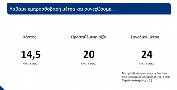 Το συνολικό κόστος των μέτρων που βρίσκονται σε εφαρμογή ή θα υλοποιηθούν διευρύνεται στα περίπου 14,5 δισ. ευρώ, και η προστιθέμενη αξία τους στα 20 δισ. ευρώ.